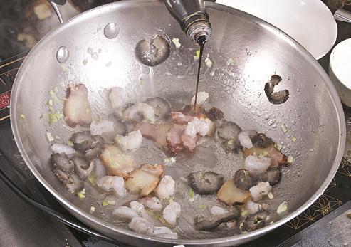 3 锅中加入少许油烧至七成热,下入葱花炒出香味;烹入料酒,放入海参片、火腿片、虾仁煸炒3分钟至熟;加入酱油、精盐快速炒匀,淋上香油,盛出。