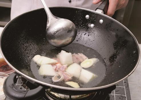 2 锅中加油烧至六成热,下入葱段、姜片爆香,烹入料酒,放入乌鸡块,用旺火煸炒片刻。