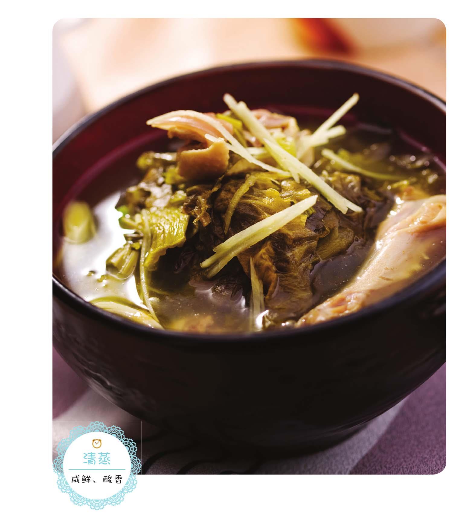 1 将咸酸菜洗净,切成片;鸭子洗净、沥水,剁成大块,放入大盘中,用微波保鲜膜封好,留一小孔出气,入炉用高火打3分钟,取出,倒去血水。