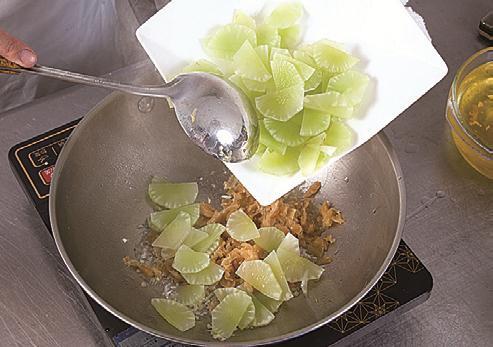1 火腿洗净,上屉用旺火蒸熟,取出切成小片;虾仁去虾线、洗净,沥干水分,切成两段。