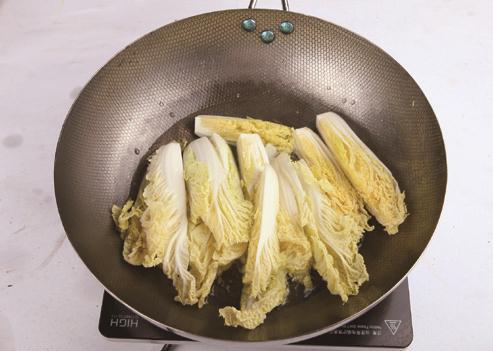 3 锅中加油烧热,下入姜片、葱段炒香,再加入鱼骨汤和清水烧沸,拣去葱段、姜片不用。