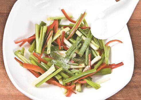 3.炒之前,将芹菜放入沸水中焯烫后要马上过凉,除了可以使成菜颜色翠绿,还可以减少炒菜时间,减少油脂对芹菜的“侵害”程度。