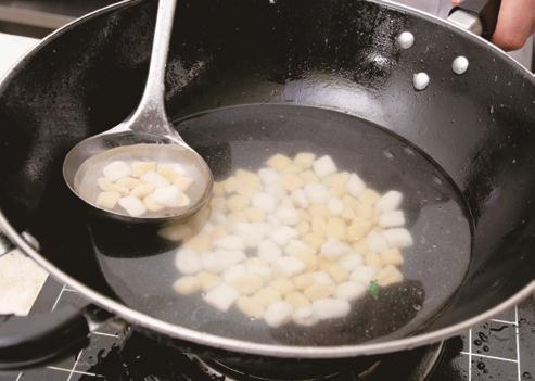 3 然后放入鲜淮山、枸杞子、姜片,煮至鲜淮山熟透,再放入冰片糖煮至溶化,即可出锅装碗。