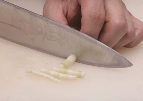 3 将香葱洗净,切成3厘米长的段;红辣椒洗净去籽,切成细丝。