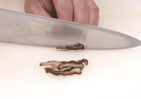 1 将水发冬菇去蒂、洗净,挤干水分,切成细丝。