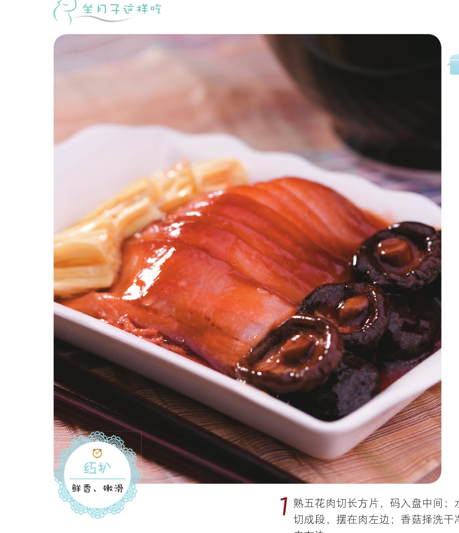 1 熟五花肉切长方片,码入盘中间;水发腐竹切成段,摆在肉左边;香菇择洗干净,摆在肉右边。