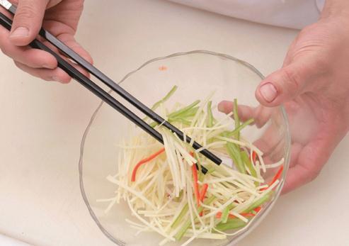 3 将香葱洗净,切成3厘米长的段;红辣椒洗净去籽,切成细丝。