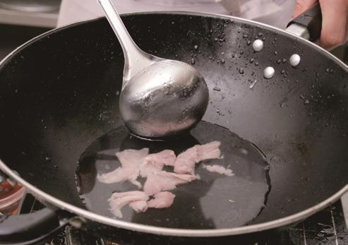 2 炒锅置火上,加油烧热,放入腊肉片旺火煸炒,待肥肉呈透明状时盛出。