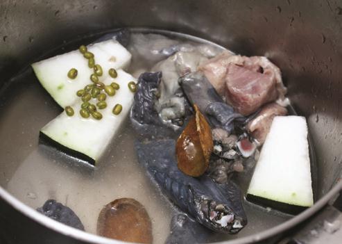 乌鸡1只,瘦肉250克,冬瓜1200克,绿豆50克,陈皮1小块。