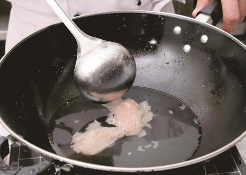 2 鸡肉洗净,切成小丁,加入精盐、料酒、淀粉拌匀上浆,再下入五成热油中滑至八分熟,捞出沥油。