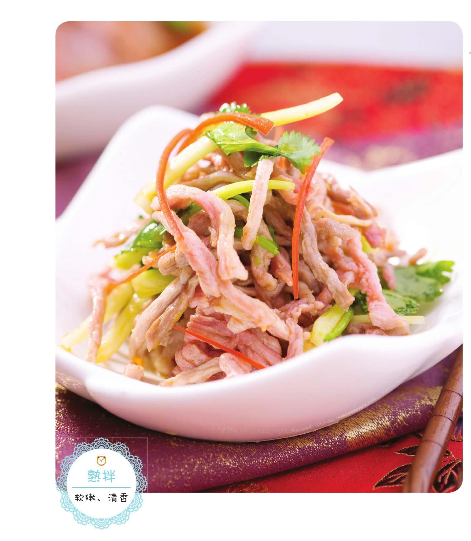 1 鸡肉入沸水中略焯,去除血污,放入加有姜、葱、料酒、香料的锅中,用中火焖熟,离火,在原汤中浸泡30分钟,然片成厚薄均6毫米的片。