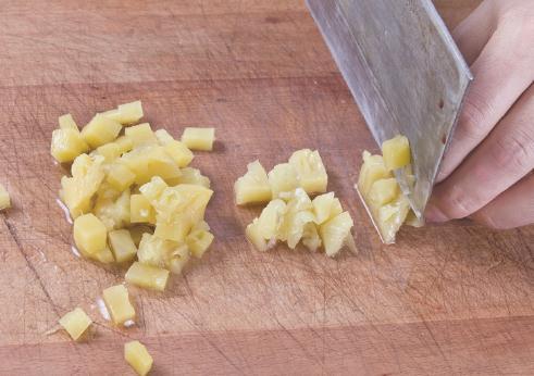 1 菠萝去皮,切成小丁,放入淡盐水中浸泡;红椒洗净,去蒂及籽,切成小丁。
