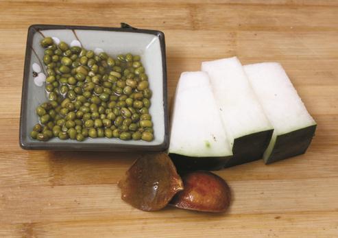 1 冬瓜去瓤,洗净,连皮切成大块;绿豆洗净,浸泡1小时;陈皮浸软,洗净。