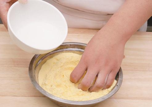 1 粘黄米粉加水和成面团,放入蒸锅内蒸熟,取出后放入容器内,浇入开水100克,用木棍搅匀;黄豆洗净,入锅炒至棕黄,碾面后过滤成粉。