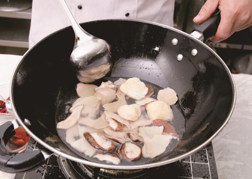 3 炒锅置火上,加入香油烧热,先下入花椒炸香(捞出不用),再放入葱丝、姜丝、蚝油炒匀,然后加入冬菇、冬笋、金针菇略炒,再烹入料酒,添入清汤,加入精盐炒至入味,即可出锅装盘。