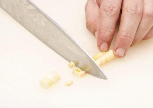 2 黄竹笋洗净,切成长段,放入沸水中焯熟,捞出冲凉,穿入鳝段中,露出两端,整齐地摆放入盘中。