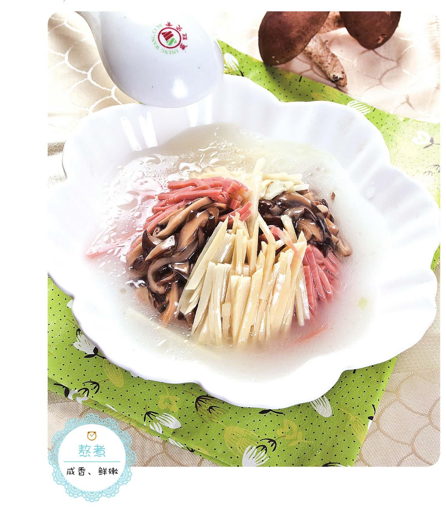 2 锅中加入鲜汤烧沸,放入香菇焯煮至熟,捞出过凉,装入盘中,加入精盐、植物油、葱末、姜末调拌均匀。将香菇条整齐地码摆在盘中成菊花形状,用黄瓜片围边,中间点缀樱桃即成。