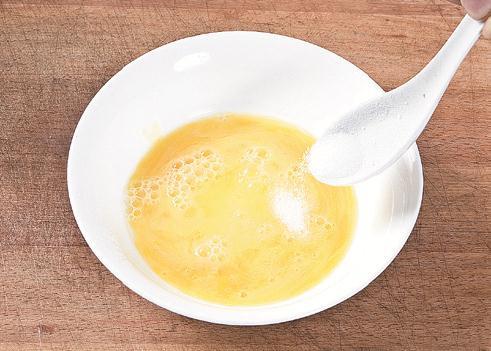 1 鸡蛋磕入碗中,加入少许精盐、淀粉及植物油搅匀成软炸糊;平菇去蒂,洗净,撕成小条。