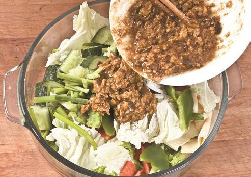 1 大白菜、干豆腐、青椒、红椒、生菜分别洗涤整理干净,沥去水分,用手撕成小片或小块,放入容器中。