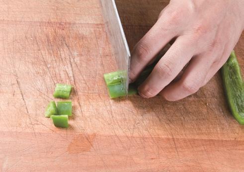 1 青椒、红椒洗净,去蒂及籽,切成小丁;取一小碗,放入少许精盐、白糖、米醋、鲜汤调匀,制成味汁。