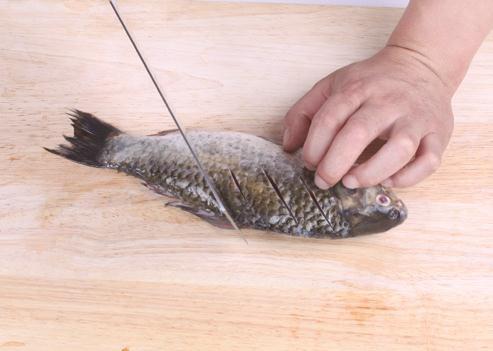 1 净鲫鱼身两侧各剞上一字斜刀;四川泡菜洗净,切成细丝;冬笋洗净,切成小丁。