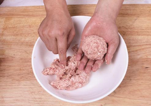 2 将馅料团成4个重约150克的扁形圆子成狮子头生坯;菜心洗净,放入净锅内,加上少许精盐炒至熟,出锅放在盘内垫底。