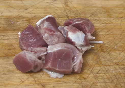 1 猪肉洗净,放在案板上,切成小块,放入沸水锅中焯烫一下,捞出沥水。
