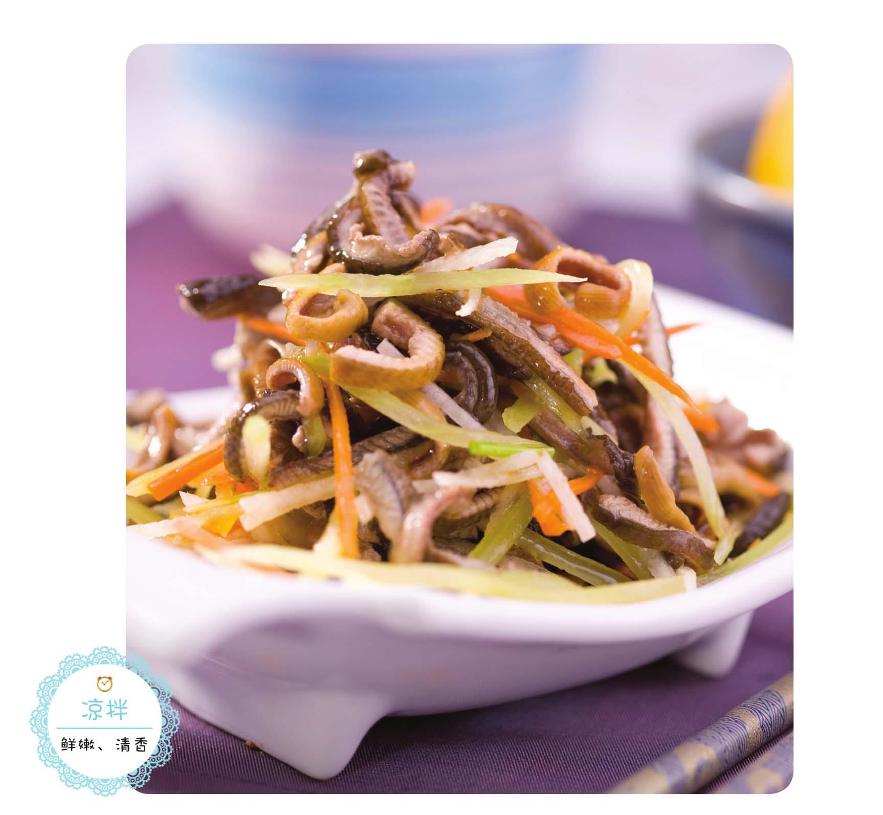 1 海螺肉洗净,片成薄片,再放入盆中,加入适量清水和食用碱,浸泡10分钟,然后下入沸水锅中焯熟,捞出晾凉,装入盘中。