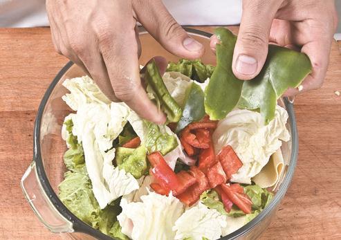 1 大白菜、干豆腐、青椒、红椒、生菜分别洗涤整理干净,沥去水分,用手撕成小片或小块,放入容器中。