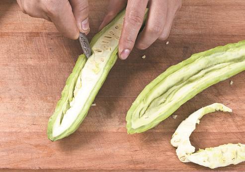 2 凉瓜洗净,切成大块;大蒜去皮,放在案板上拍碎。