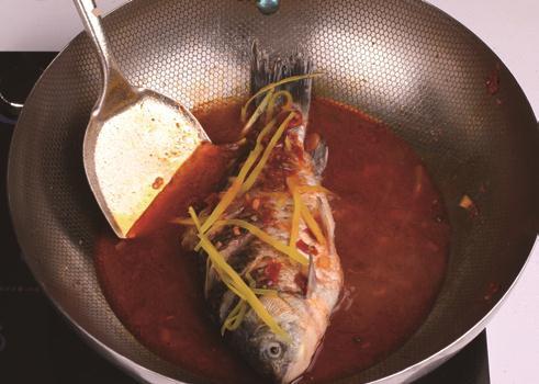 2 锅中加油烧热,下入鲫鱼煎炸至呈黄色,捞出沥油,再放入泡红辣椒、泡姜和醪糟汁炒香。
