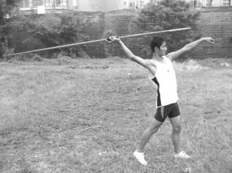 (1)预跑:投掷标枪预跑时,身体略前倾,右手持枪随跑动节奏轻微振动,左手自然摆动。预跑根据运动员自身特点来决定距离长短,力量型运动员距离较短,速度型运动员距离较长。一般距离为12~20米,步数在8~14步。