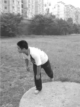 铅球出手后,右腿随蹬地惯性向前,左腿后摆,形成一个换步,身体在左转的同时降低重心,帮助缓冲向前的冲力,维持身体平衡。(图2-47、图2-48)
