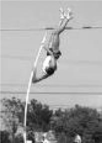 推竿让身体重心上升到最高位置时,已经越过横杆的双腿主动下压,并收腹、含胸成类似马蹄状姿势(图2-23)。当臀部越过横杆时,双臂上扬,抬头,使整个身体依次越过横杆(图2-24)。
