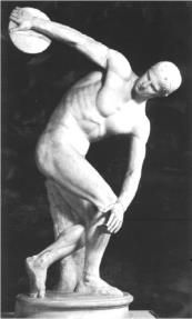 提到掷铁饼就会让人联想到古希腊伟大的艺术家米隆的著名作品——“掷铁饼者”(图2-61)。掷铁饼和掷铅球都是源于古代人类用石头击打猎物,掷铅球是投掷圆石演变而来,而掷铁饼则是投掷扁石演变来的。