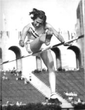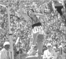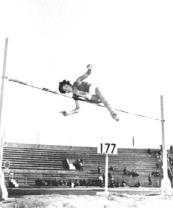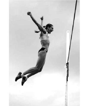 男子跳高项目在第1届奥运会时就成为了正式的比赛项目,而女子跳高项目则是在第9届奥运会时才被允许进入奥运会赛场。跳高项目的发展史实际上就是跳高技术不断改进的过程,每一次跳高技术的革新都将带来跳高成绩的大幅度提升,都必将成为跳高项目发展史上的里程碑。跳高技术的革新经历了以下几个阶段:跨越式跳高(图2-9)——剪式跳高(图2-10)——滚式跳高——俯卧式跳高(图2-11)——背跃式跳高(图2-12)。