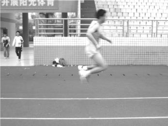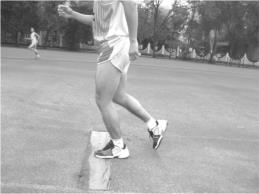 (3)最后阶段,也就是最后的6~8步,是助跑技术中的重要环节。在保持高速跑进的过程中,倒数第二步的步幅要稍微大一点,最后一步起跳腿加速下压,积极踏板,步幅比倒数第二步稍短。