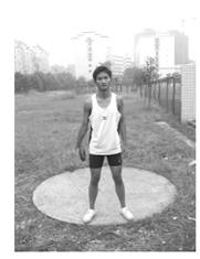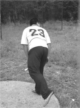 (2)投掷步:从预跑时左脚踏上第二标志线开始,到投掷前最后一步左脚落地为止。其步数一般是四步或六步,左脚踏上标志线;如果是五步或是七步,则是右脚踏上标志线。我们介绍四步投掷步技术: