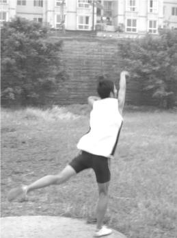滑步结束后,右脚着地时借助已经形成的内扣姿势,迅速往投掷方向蹬转,带动右髋向投掷方向转动,这时下肢和髋的转动都超前于上体的转动,从而使上体和下体在腰部形成扭紧姿势。左脚在右脚蹬伸的过程中积极着地。上体在转动中逐渐抬起,并使身体从背对转至侧对投掷方向,左肩高于右肩,身体重量还是大部分落在右腿上,整个身体形成一个侧弓姿势。(图2-45)