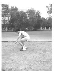 (1)踏板(Touch down):踏板技术是从助跑的最后一步开始的。在助跑最后一步,起跳腿积极下压,脚跟和脚掌几乎同时着板,并迅速向下、向后扒地。(图2-25)