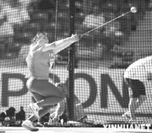 器械出手后,右腿应及时向跨出一大步,并降低重心。因此,一般运动员都会留出距投掷弧2米以上的距离来完成缓冲动作。(图2-60)