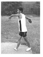 双腿都着地后,右腿蹬地带动膝关节、髋关节迅速向投掷方向转动,并带动上体和投掷臂运动,上体和投掷臂在转动过程中要充分伸展。左腿要稳稳固定住,身体重心移至左侧,铁饼被鞭打式发力投出,在离手瞬间,右手食指末端拨饼,让铁饼顺时针转动飞出。(图2-70、图2-71)