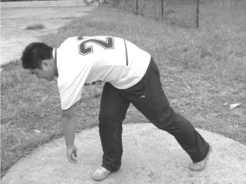 运动员背对投掷方向站在投掷圈后沿,两脚开立,与肩同宽或略宽。两腿微屈,链球放在身体右后侧,两臂伸直。上体前倾稍向右转。(图2 -75)