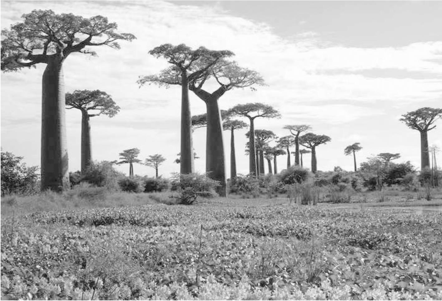 每当旱季来临,为了减少水分蒸发,它会迅速脱光身上所有的叶子。一旦雨季来临,它就利用自己粗大的身躯和松软的木质代替根系,如同海绵一样大量吸收并贮存水分,待到干旱季节慢慢享用。据说,它能贮几千千克甚至更多的水,简直可以称为荒原的贮水塔了。