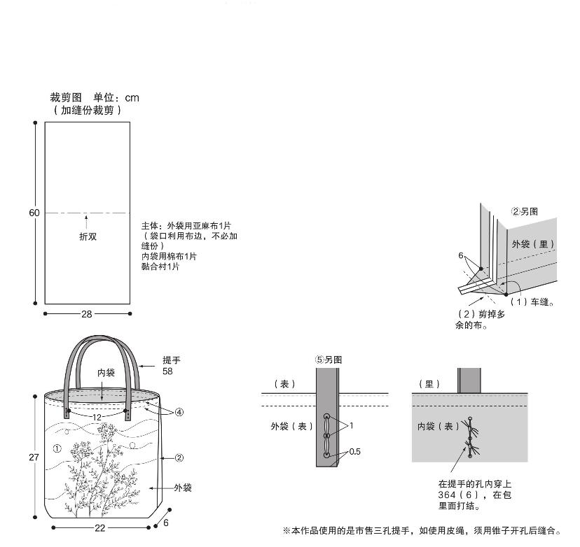 【布】外袋用亚麻布(颜色、花样参照照片)60cm×40cm,内袋用棉布70cm×40cm,黏合衬70cm×40cm。