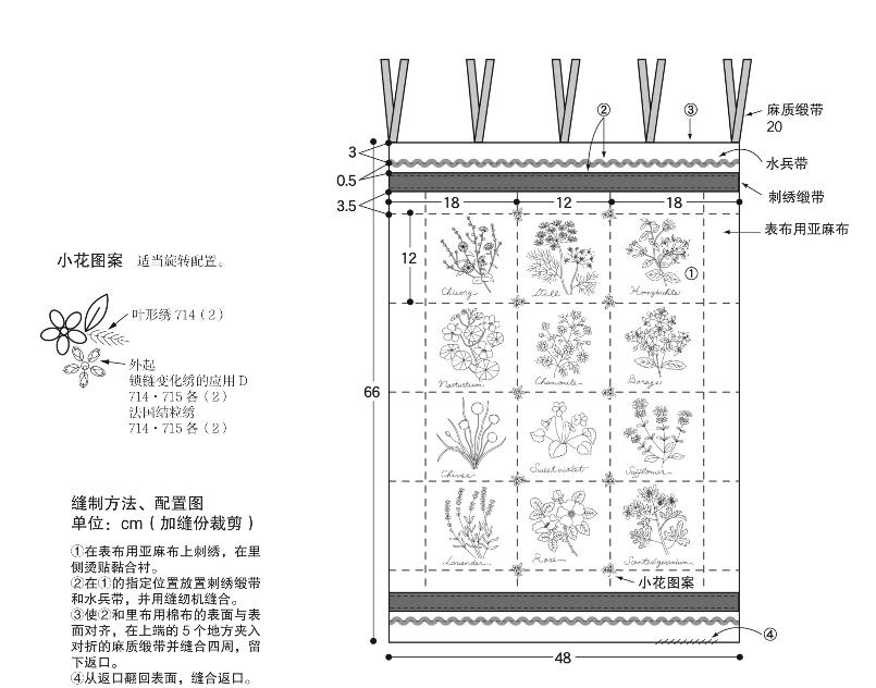 ※因版面有限,图案分别解说,请参照配置图适当配置。此外,本作品是利用布的格子花纹(边长4cm正方形,每行居中取9格)来配置图案的。