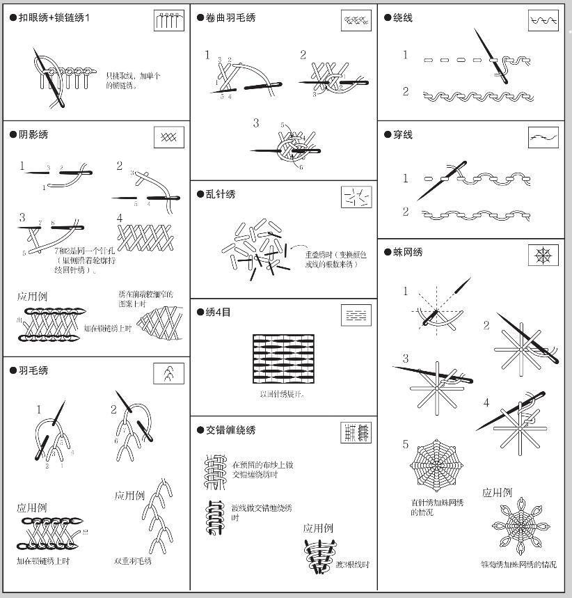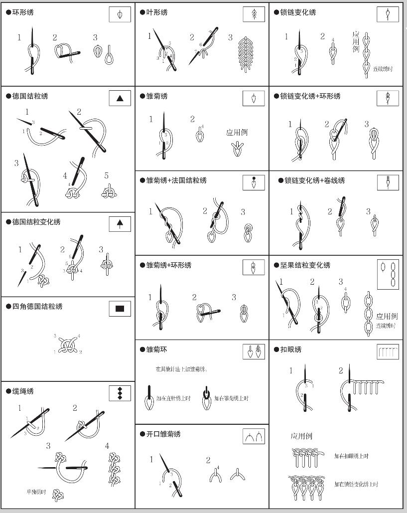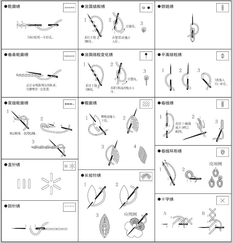 这里介绍的是刺绣时使用频率较高的针法。同类型的针法按列编排集中介绍。此外,图案中的针法符号在各针法右上角的框内显示。