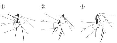 左手拿针,右手拿线的一端。线就着针上部,折成两股(图①)。用大拇指和食指夹好两股线,把针取出,两股线并好(图②)。然后将线对折的部位对准针孔,稍松开大拇指和食指,穿过针眼(图③)。