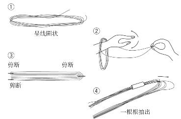 将绑25号刺绣线的纸带去掉,恢复成线圈状态(图①)。然后把手放入线圈内,抓起线的两头,将线圈散开,注意不要缠在一起。这时,放入线圈内的手左右晃动会更好(图②)。全部解开后,将每一半长度的线都对折两次,变成八等分长后将线剪断(图③)。将剪好的线穿入写有线号的纸带,以方便配色或者加线。用时再麻烦也要按所需根数一根根抽出,备好。抽线时宜抓住线的中间部位抽,才不会缠绕。一根根地抽可使线齐整,不会耗损线的光泽,绣品也更美观(图④)。