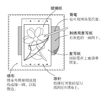 先在复写纸上描摹图案,定好格局后将图案平放在绣布上。图案要与布纹保持垂直。绣布要提前熨平整,经线、纬线要拉直。绣布外围要用疏缝线疏缝一圈,以防散边。将刺绣用复写纸夹在图案和绣布中间,用珠针固定。图案上放玻璃纸,从上方用骨笔勾描。描完后检查一下有没有漏描的地方,再去掉珠针。
